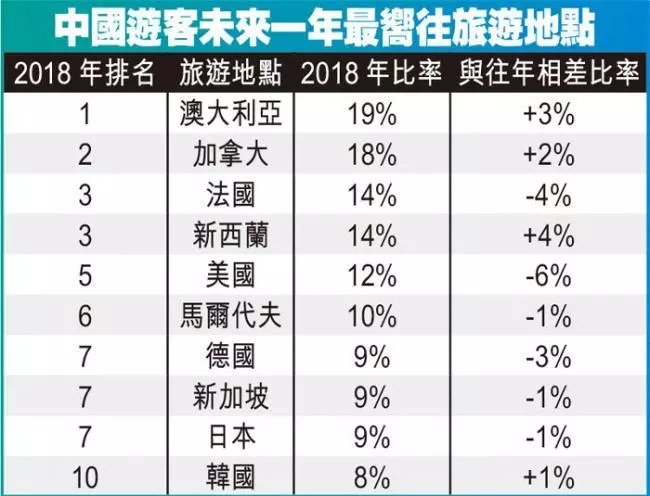 数据统计, 2017年有75万中国游客来加拿大观光旅游。 好订网(Hotels.com)的《2018年中国游客境外旅游调查报告》显示,在过去12个月中加拿大境内的中国游客人数已大幅上涨67%。在中国游客最向往的10个国家当中,到访加国的中国游客人数大幅度上升,加拿大更在“中国游客未来一年内最向往旅游目的地排名”中,超过美国与法国,仅次于澳大利亚名列第二位。